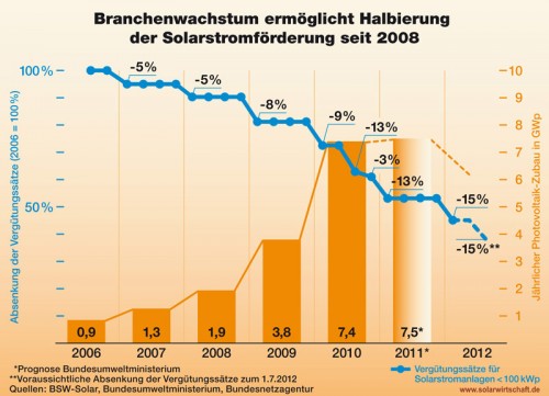 Despite the figures, industry representatives are not all sunny optimism regarding the future. “Despite the stable and growing demand in Germany and in some other international markets, turnover and profits for 2011 remain below the expectations of many companiesâ€, GSIA said. “The industry hopes for improvement through a significant upswing in international markets in the coming years. For Germany, the industry expects declining demand due to the statutory cuts in support for 2012, which will total approximately 30 percent.â€