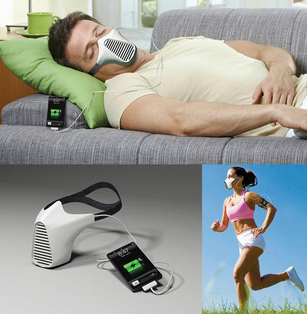 The device is actually a mask featuring minuscule wind turbines. These transform the air we breathe out into energy, which is then transferred to an iPod, a GPS or a cell phone, to name but a few, through a USB cable.