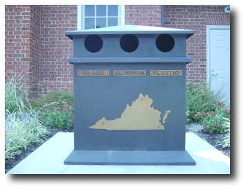 I was driving on I-64 today, and had to make a pit stop at the rest area at mile marker 213. It is a new, architecturally-styled, rest area in brick, with a visitor center, new bathrooms and a bin for recycling. The bin had three different sub-bins: Plastic, Glass and Aluminum. All of this was encased in a very stylish brick block with an outline of the Commonwealth of Virginia in brass.