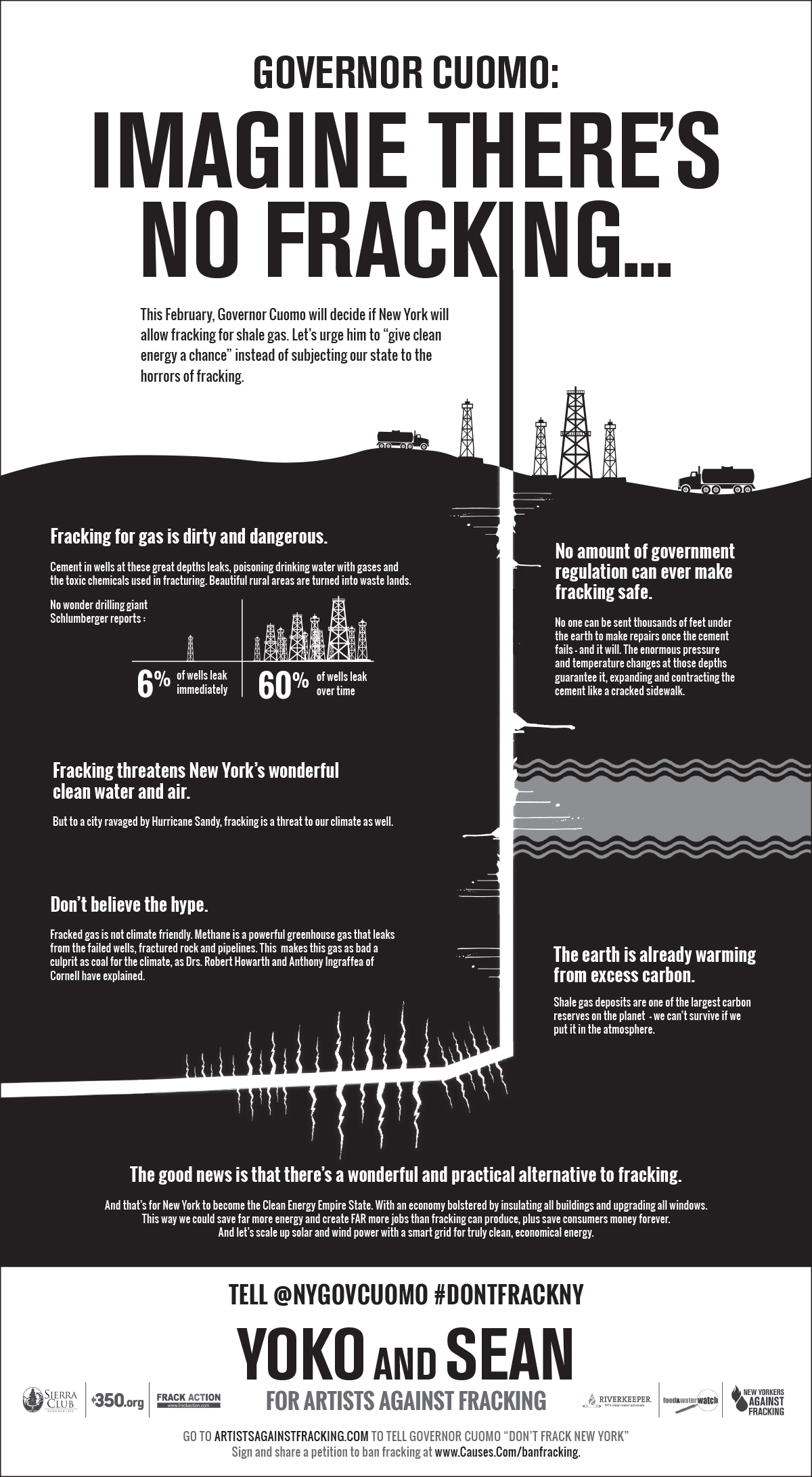 Legendary artist, singer, performer and activist Yoko Ono has lent her support to the anti-fracking campaign. On Monday Yoko placed a full page in the New York Times calling on Governor Cuomo to “Image There’s No Fracking … and give clean energy a chance.†The ad illustrates and describes how cement in wells at such great depths leaks, poisoning drinking water with gases and toxic chemicals.
